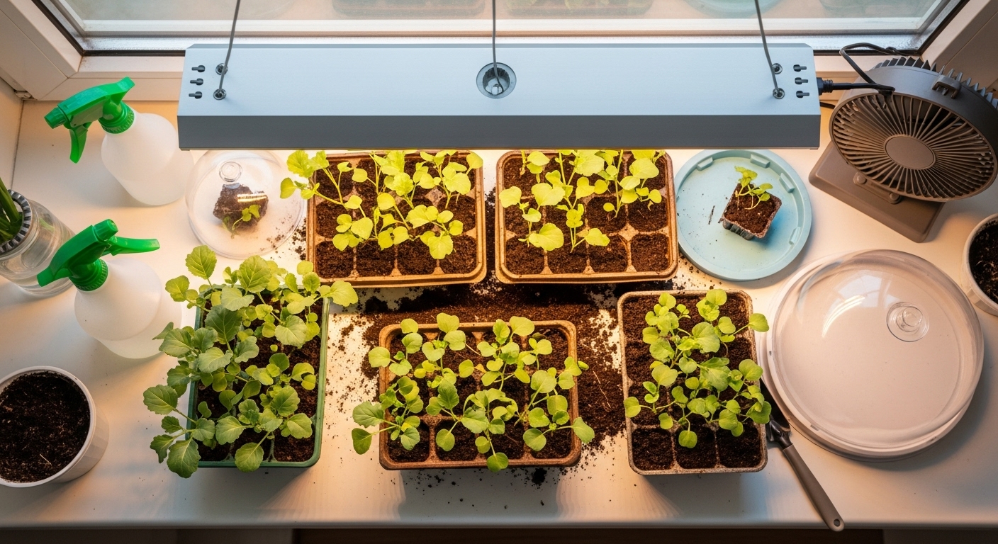 Cover the tray with a clear plastic dome or wrap to keep humidity high, and place it in a warm spot—around 65–75°F is ideal for germination. Once sprouts emerge in 5–10 days, remove the cover and move trays under grow lights or near a bright window. Seedlings need at least 14–16 hours of light daily to avoid becoming leggy.
